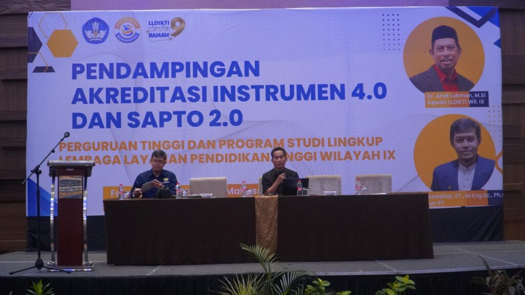 Lembaga Layanan Pendidikan Tinggi (LLDIKTI) Wilayah IX Sultanbatara menyelenggarakan kegiatan Pendampingan Akreditasi Instrumen 4.0 dan SAPTO 2.0 bagi Perguruan Tinggi dan Program Studi di lingkup wilayah kerja LLDIKTI IX Sultanbatara. Kegiatan ini bertujuan untuk meningkatkan pemahaman serta kesiapan institusi pendidikan tinggi dalam menghadapi proses akreditasi berbasis instrumen terbaru.