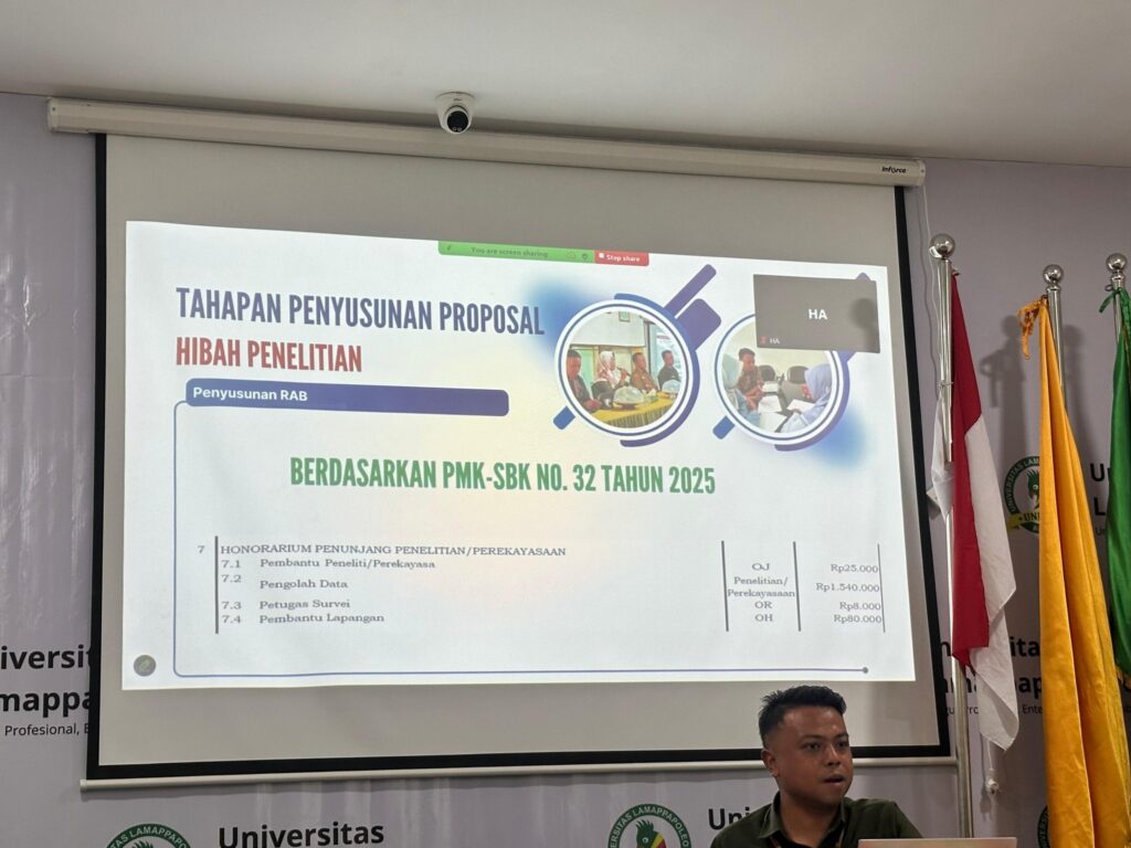Universitas Lamappapoleonro melalui Lembaga Penelitian dan Pengabdian kepada Masyarakat (LPPM) menyelenggarakan Workshop Penyusunan Proposal Hibah Penelitian dan Pengabdian kepada Masyarakat Program Kompetitif Nasional Tahun 2026, pada Senin, 8 Desember 2025 bertempat di Ruang Pertemuan Rektorat Unipol.