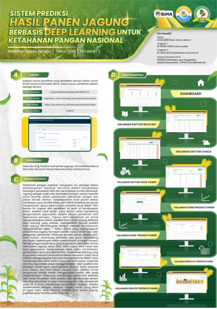 Tim Peneliti Universitas Lamappapoleonro (UNIPOL) berhasil mengembangkan Sistem Prediksi Hasil Panen Jagung Berbasis Deep Learning sebagai bagian dari luaran Penelitian Dosen Pemula (PDP) Tahun 2025 yang didanai oleh Direktorat Penelitian dan Pengabdian kepada Masyarakat (DPPM) Kemdiktisaintek. Penelitian ini bertujuan mendukung ketahanan pangan nasional melalui pemanfaatan teknologi kecerdasan buatan untuk meningkatkan akurasi prediksi hasil panen jagung berdasarkan data cuaca, kondisi lahan, dan histori panen. Sistem yang dikembangkan dilengkapi dengan dashboard interaktif, fitur prediksi real-time, serta visualisasi data yang mendukung pengambilan keputusan di sektor pertanian. Luaran penelitian ini ditargetkan dipublikasikan pada jurnal nasional bereputasi terindeks SINTA sebagai kontribusi nyata perguruan tinggi dalam inovasi teknologi pertanian berkelanjutan.