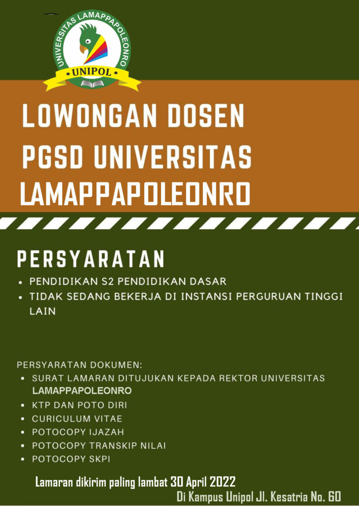 Universitas Lamappapoleonro Membuka Lowongan untuk calon dosen PGSD Tahun Akademik 2022 – 2023. Silahkan kirim berkas pendaftaran di Kampus Universitas Lamappapoleonro Jl. Kesatria No. 60 Watansoppeng.